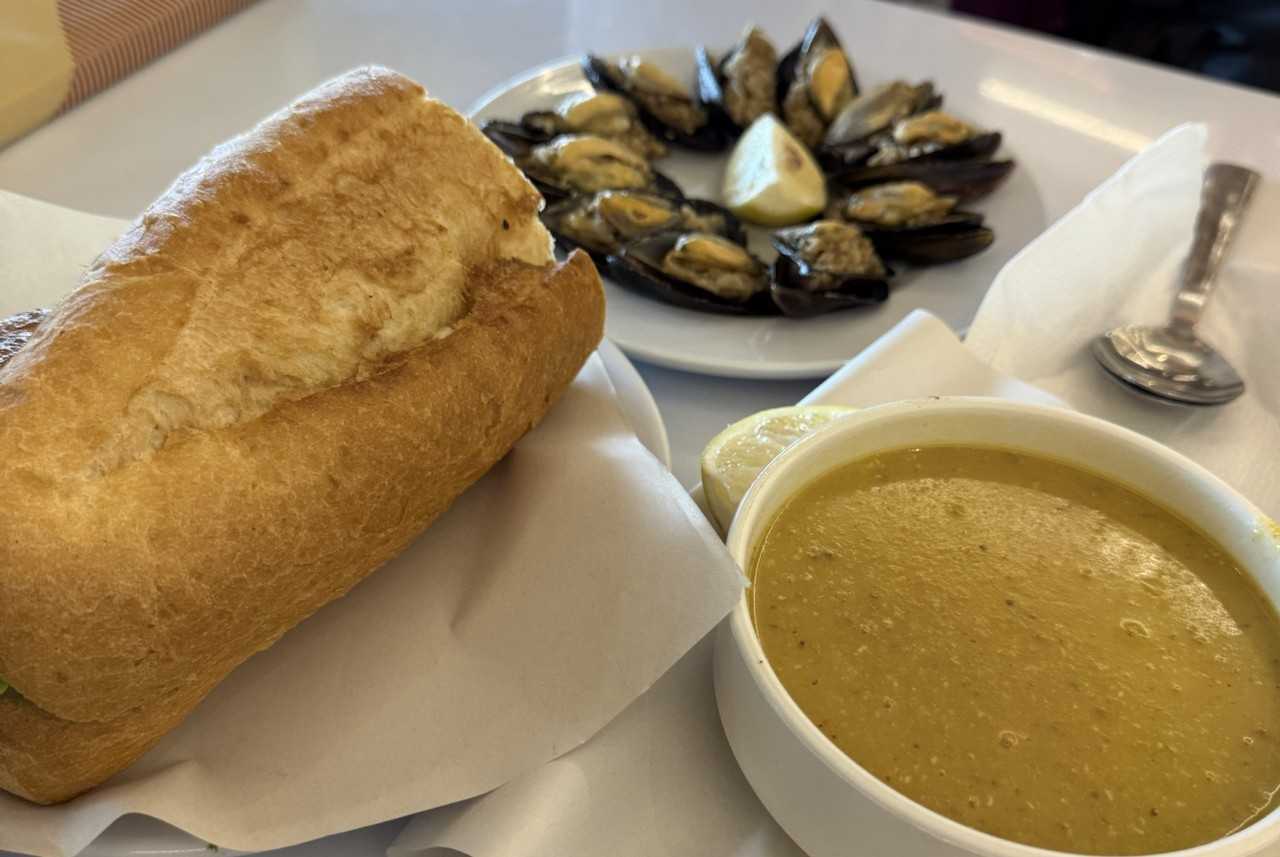 - せっかくなので橋の下のレストランで有名な鯖サンドとミディエ・ドルマスを食べることにしました.